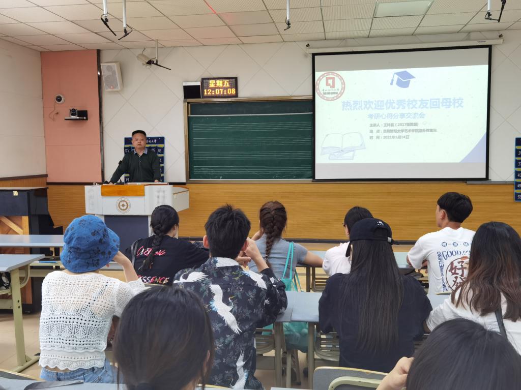 2021年5月14日,做爱漫画 在逸夫楼综合教室,开展了“优秀校友回母校---考研经验分享交流会”活动。本次活动邀请了做爱漫画 2017级舞蹈专业的王梓航和2017级环境设计专业的赵丽娜分享考研经历,学院正处级组织员、院关工委副主任王松和有考研意向的30多名同学一同参加了此次活动。