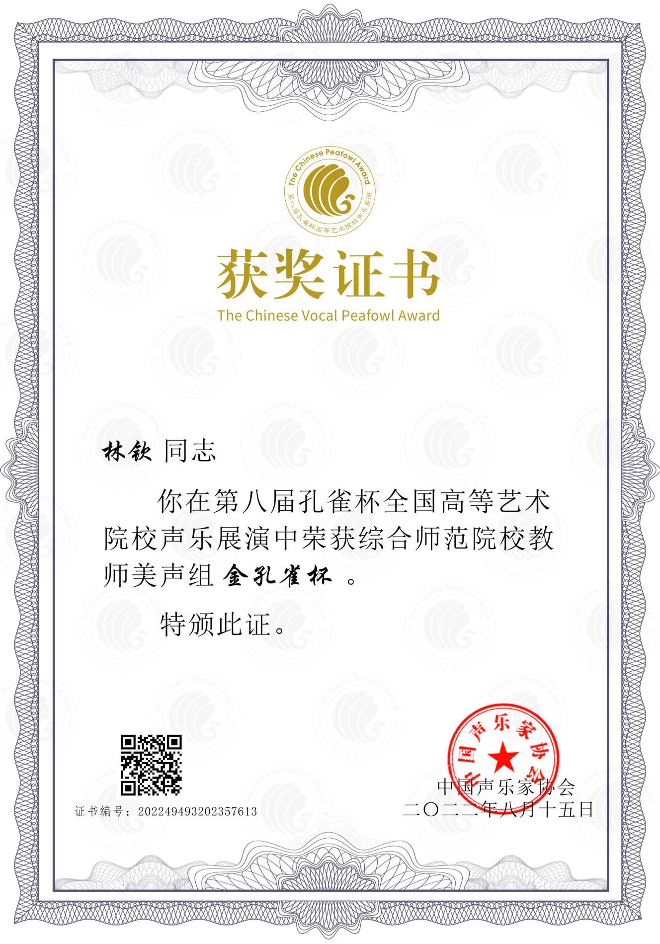 音乐与舞蹈系副主任、声乐教师林钦获得全国金奖的好成绩。2018级学生叶思汉、2020级学生吴刚在本次比赛中荣获优秀奖。