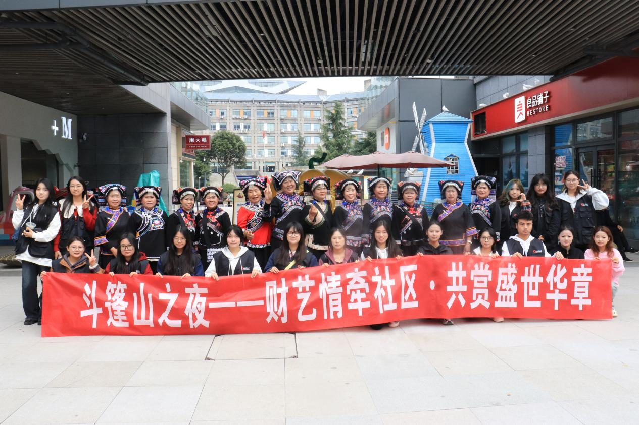 志愿者与社区在广场共同开展《斗篷山之夜—财艺情牵社区·共享盛世华章》文艺演出。开场舞《盛世欢歌》以其激昂的节奏和绚丽的舞姿瞬间点燃了现场的气氛。歌曲独唱《阳光路上》歌声嘹亮,唱出了对美好生活的向往。此外,还有朗诵等精彩节目上演。社区居民们围坐在舞台周围,不时爆发出热烈的掌声和欢呼声。